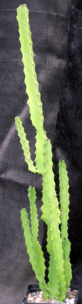 This tall, tree-like species is from Sierra Leone. Ovate, deciduous leaves form at the ends of the stems, which are 3-5 angled and lined with small spines. These plants are rooted cuttings in 5-inch pots.