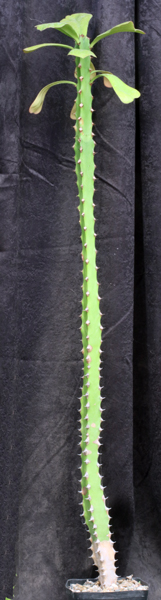 This tree Euphorbia is from Nigeria and Cameroon. The beautiful green stems are 5-7 angled with small white spines. The relatively large leaves are green with reddish tinge. Red cyathia are produced on long peduncles. All in all, this is a beautiful species that rivals some similar species from India. We offer rooted cuttings of this species in one-gallon pots.
