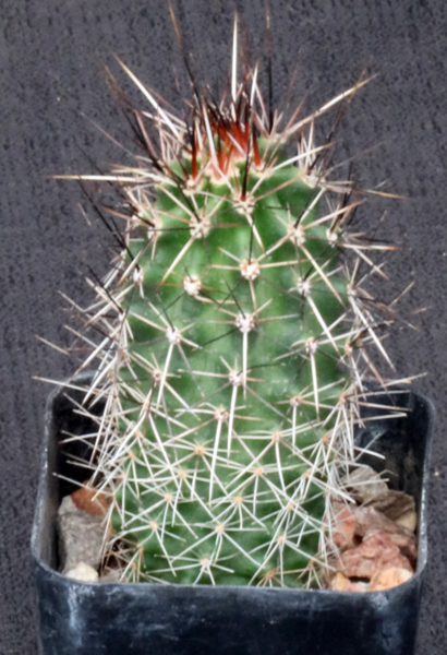 From the Sonoran Desert of the US and northern Mexico, this columnar species clumps to form plants with cylindrical stems bearing grayish-white spines over the light green body. The flowers are broad and purple. These plants are seedlings in 2-inch pots.
