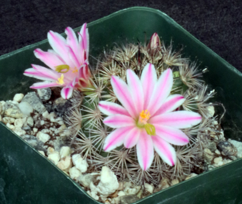 This densely-spined, typically solitary species is from Baja California, Mexico. The central spines are black and the lateral spines are gray and somewhat obscure the light-green columnar body. The flowers are pinkish-white. These plants are seedlings in 4-inch pots.