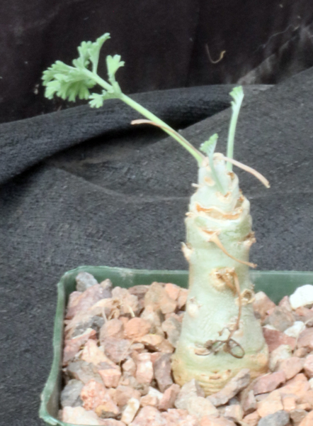 Recently combined into P. carnosum, Pelargonium ferulaceum is a tall branched shrub with fleshy, divided leaves. The overall P. carnosum complex is spread over western South Africa and Namibia. The flowers are white to greenish yellow. These seedlings are in 5-inch pots.