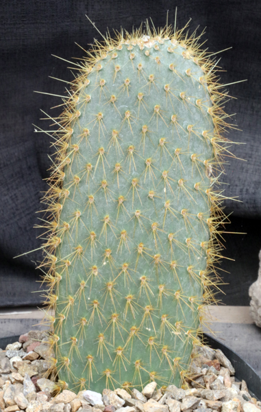 This species is from the Galapagos Islands. It has pads with the distinctive yellow spines, turning brown with age, and tiny glochids. The flowers are yellow. These plants are rooted offsets in one-gallon pots.