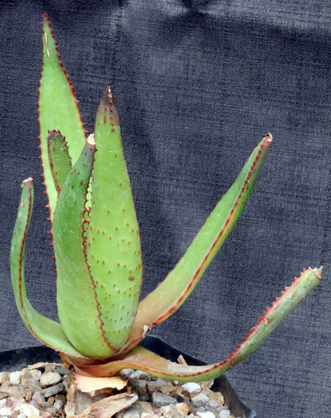 From Madagascar, this species previously considered a variety of Aloe capitata was raised to species level in the recent book on Aloes of Madagascar. This species forms a simple, arborescent rosette and typically grows in the shade on marble rocks. It has light blue-green leaves with scattered tubercles on the lower side. The flowers are orange-yellow. These plants are seedlings in one-gallon pots.