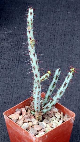 From the Northern Province of South Africa, this small tufted shrub has beautiful blue-green stems and spine shields with two pair of copper colored spines. Closely related to E. schinzii and E. lydenbergensis, this species makes a beautiful potted plant with its coloration and yellow cyathia. We previously offered three varieties of this species, but two of those (major and minor) are lumped together here. These are rooted cuttings in 3-inch pots.