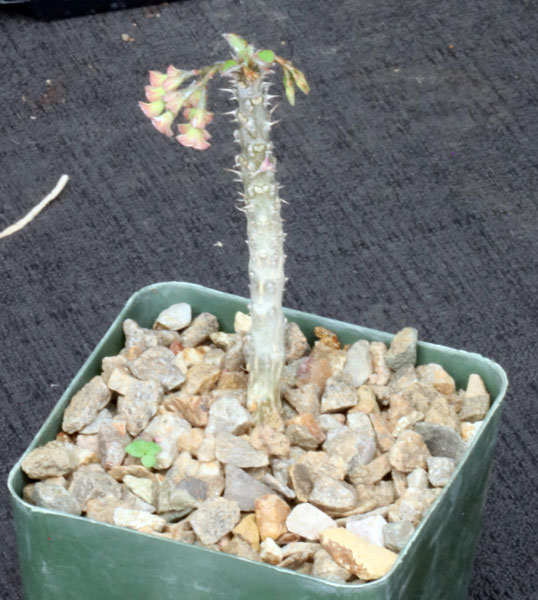 This is a recently described species from Madagascar. A small shrub, it appears to be related somewhat to Euphorbia decaryi although it differs because of stiffer stems and quite different leaves. These plants are rooted cuttings in 4-inch pots.