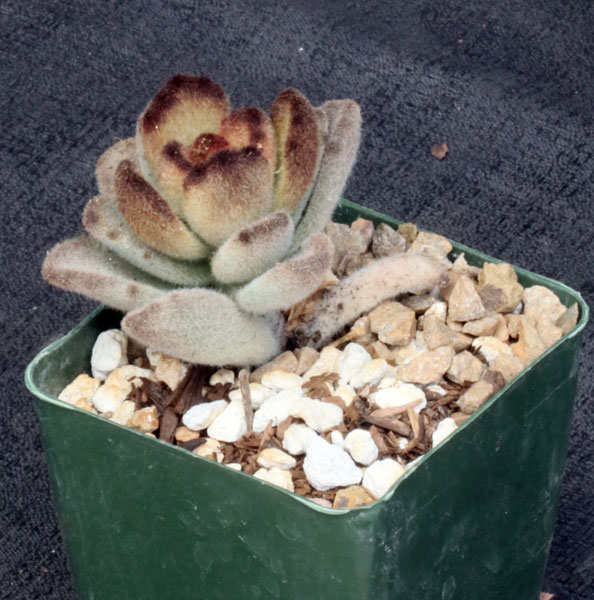 This species, from Madagascar, is a perennial with woody basal stem and nice, curled leaves. The version of this species we offer is a cultivar called "Teddy Bear," apparently for the chocolate brown leaf edges and the leaf shape, which is chunkier than the typical version. These plants are rooted cuttings in 4-inch pots.