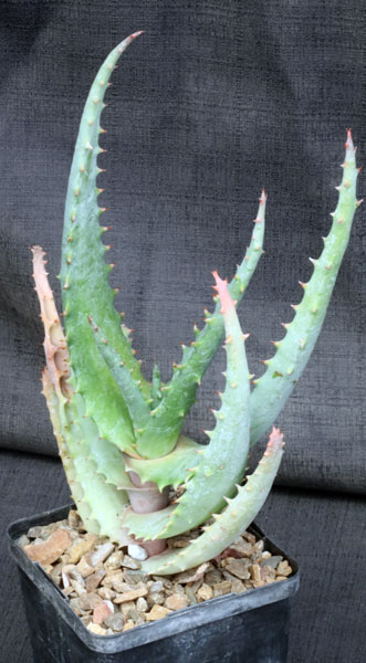 From a broad area ranging from Zimbabwe to Botswana to the northeastern parts of South Africa, this blue-green Aloe is known for its nearly horizontal racemes with secund, multicolored flowers. It suckers proliferously, and We’ve grown this species outside in Tucson for many years. It has endured 23F under a shrub with little damage. These plants are seedlings in 5-inch pots.
