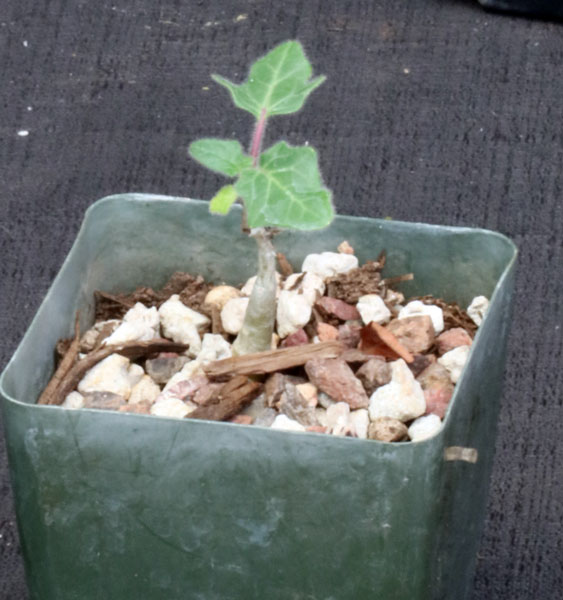 This short pachycaul from Madagascar has thick pale gray rounded stem that looks like a ball with branches covered with tufts of slightly lobed leaves at tips of stems. The leaves are covered with soft downy hair, and the flowers are yellow. These are seedlings in 4-inch pots.