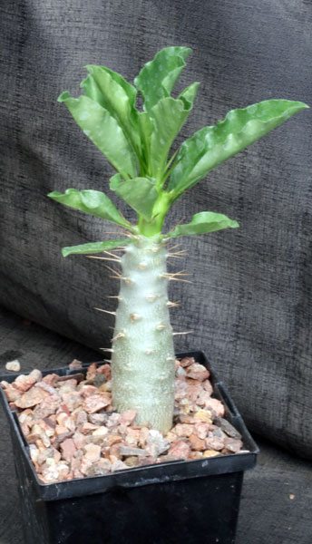 From southern Zimbabwe to the northern provinces of South Africa, this species has a swollen caudex, spiny stems, lanceolate-ovate leaves, and white flowers with pinkish throat produced in the fall. Pachypodium saundersii is very easy to grow large and flowers at about this size. These seedlings are in 5-inch pots.