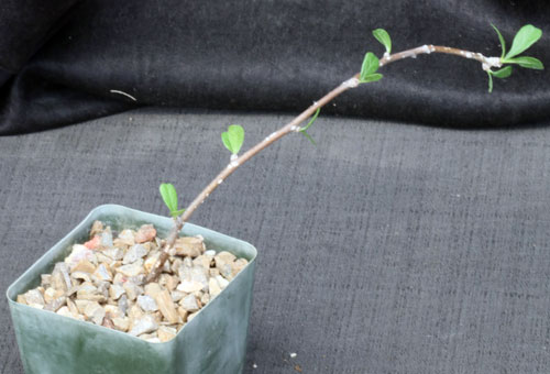 Jatropha dioica is a shrubby species with a range from Texas to southern Mexico. It has wand-like stems bearing 3-5 lobe leaves at the apex and small, yellow-purple flowers. It is hardy in Tucson to perhaps 15F. These plants are rooted cuttings in 4-inch pots.