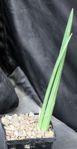 This is a relatively small species from Madagascar. These plants have long, round leaves with 5-6 channels, superficially resembling S. erythraeae and S. patens. The leaves on S. canaliculata, however, are light green compared with the typically darker S. erythraeae, which comes from region centered on Ethiopia, and are upright. These plants are rooted offsets in 5-inch pots.
