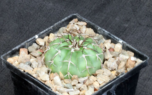 This species is from eastern Brazil, and some consider it to be part of the Discocactus placentiformis complex. It is distinctive for its bright green body with black, claw-like spines and a white cephalia. The flowers are white with purplish highlights. These plants are seedlings in 5-inch pots.