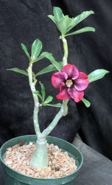 This cultivar was developed in India by a large grower of cultivar Adenium. It has flowers that are about the same size as typical A. obesum flowers, only multicolored purple with lighter streaks on the pedals and light yellow throats. These plants are grafted cuttings on Adenium obesum in 6-inch pots.