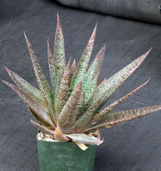This Gasteria hybrid has broad, triangular leaves with patterning, reddish hues, and numerous white spots. The flowers are held in a multi-branched inflorescence and are orange. These plants are rooted offsets in 4-inch pots.