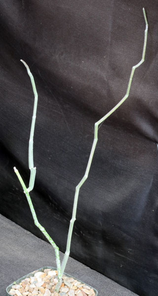 Not surprisingly, this species is from the island of Socotra south of Yemen. It is a straggling shrub notable for its zig-zagging green stems. This makes an extremely nice hanging pot plant. These plants are rooted cuttings in 5-inch pots.