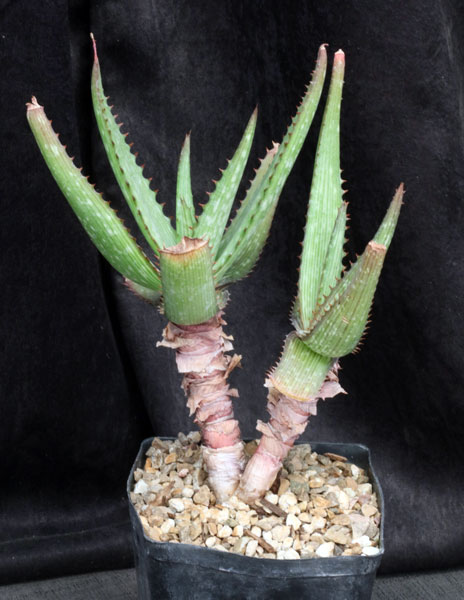 From KwaZulu-Natal Province of South Africa, this spotted Aloe rarely offsets. The blue-green leaves with dense white spots are very attractive, and the flowers are red-orange. These plants are seedlings in one-gallon pots.