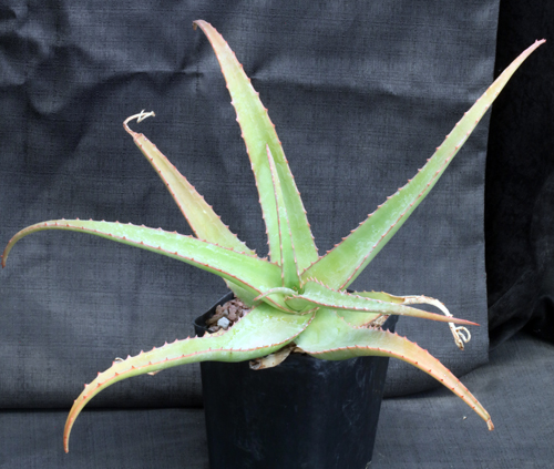 From Ethiopia and Somalia, this short-growing species with large, spreading leaves forms a shrub in habitat. The deeply channeled leaves have magnificent, reddish teeth. The flowers are variable in color, from yellow to red. These plants are rooted offsets in one-gallon pots.